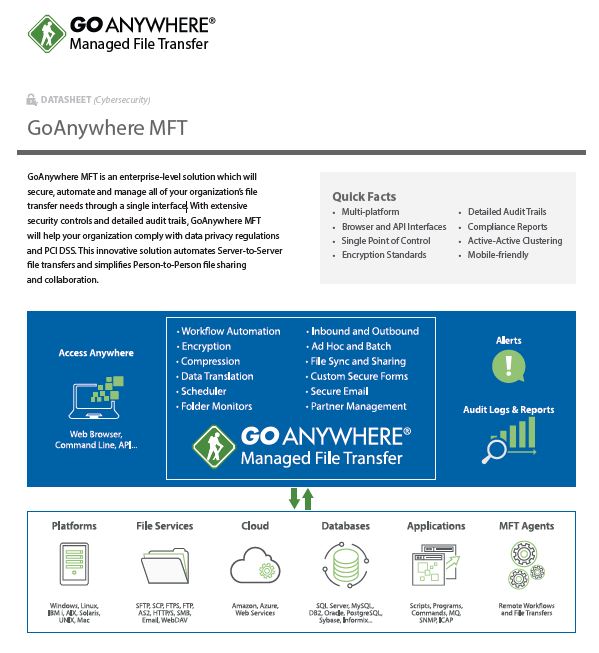 GoAnywhere MFT est une solution destinée aux entreprises pour sécuriser, automatiser et gérer tous vos besoins de transfert de fichiers de votre organisation dans une seule interface.