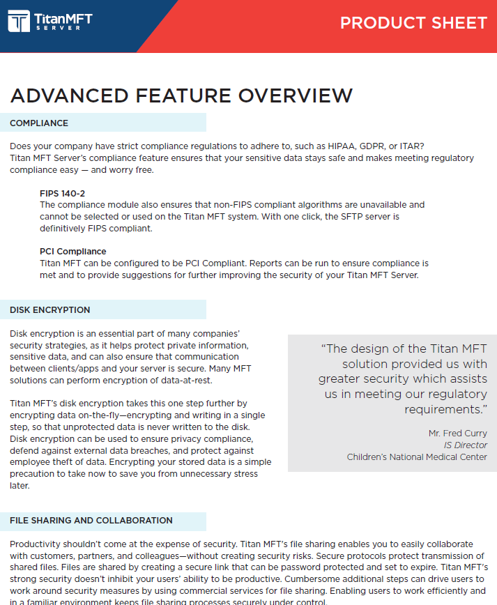 COMPLIANCE, DISK ENCRYPTION, FILE SHARING AND COLLABORATION, ADVANCED REPORTING, TITAN DMZ SERVER